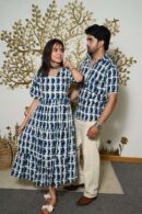 This White And Blue Printed couple matching outfit includes a women?s flowy cotton midi dress and a men?s short-sleeve printed shirt. Designed with cheerful yellow floral prints, this set is perfect for summer outings, casual gatherings, or twinning on vacations.